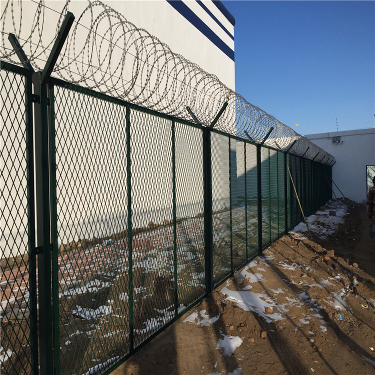 頂部結(jié)構(gòu):這是最關(guān)鍵的部分。通常設(shè)有向內(nèi)或向外傾斜的蛇腹形刀刺網(wǎng),或呈“Y”形的防攀爬倒刺?hào)艡?/span>。這是最有效的物理和心理威懾。
